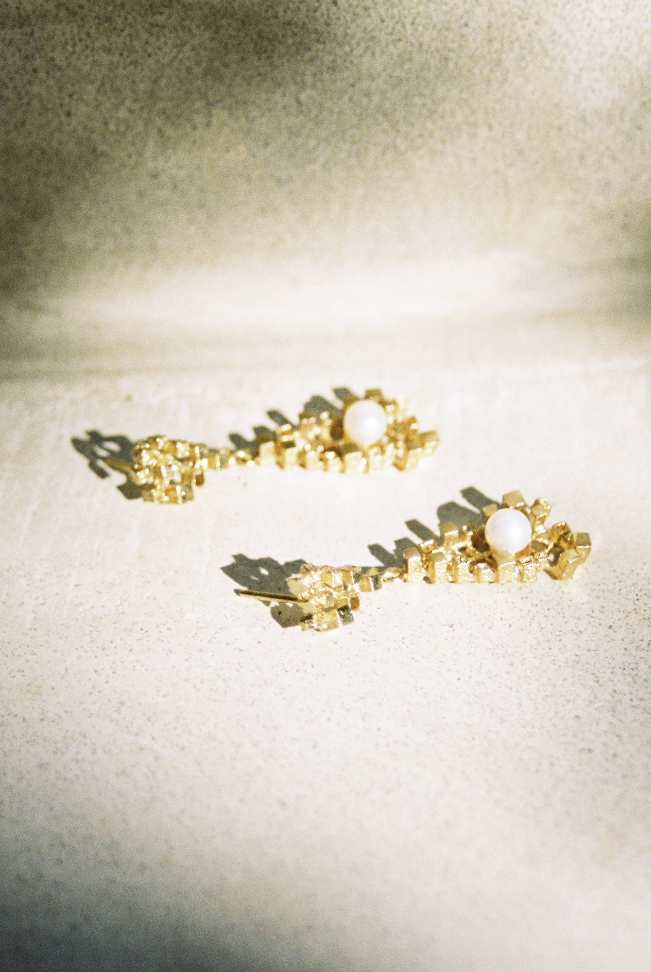 C. 1970’s - 1980’s. Amazing pair of double drop 14k yellow gold brutalist style studs, consisting of tiny raised cubes, set with lustrous white freshwater pearls. The gold has a variety of textures, giving even more depth to the raised elements. These earrings have great fluidity and feel when worn, extremely unique.