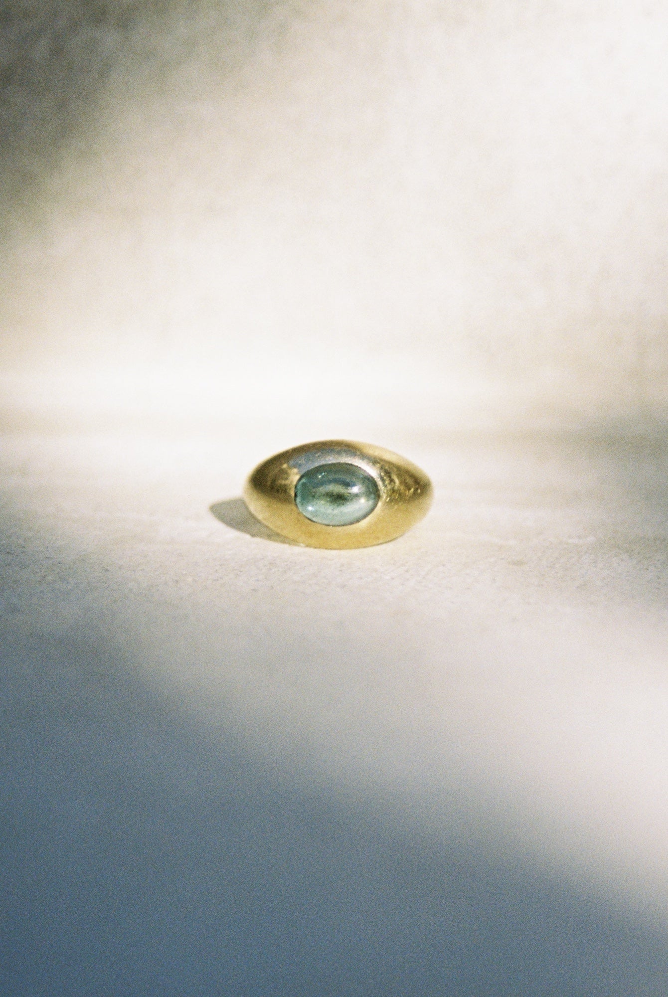 C. 1950's. A classic 14k domed shape ring featuring a set oval tourmaline cabochon. This ring is a timeless classic. The perfectly forest-aqua stone compliments the gold beautifully, looking like a droplet of water. This is a great everyday ring, and will compliment any gold stack so well. Purity marked on the inside of the band.