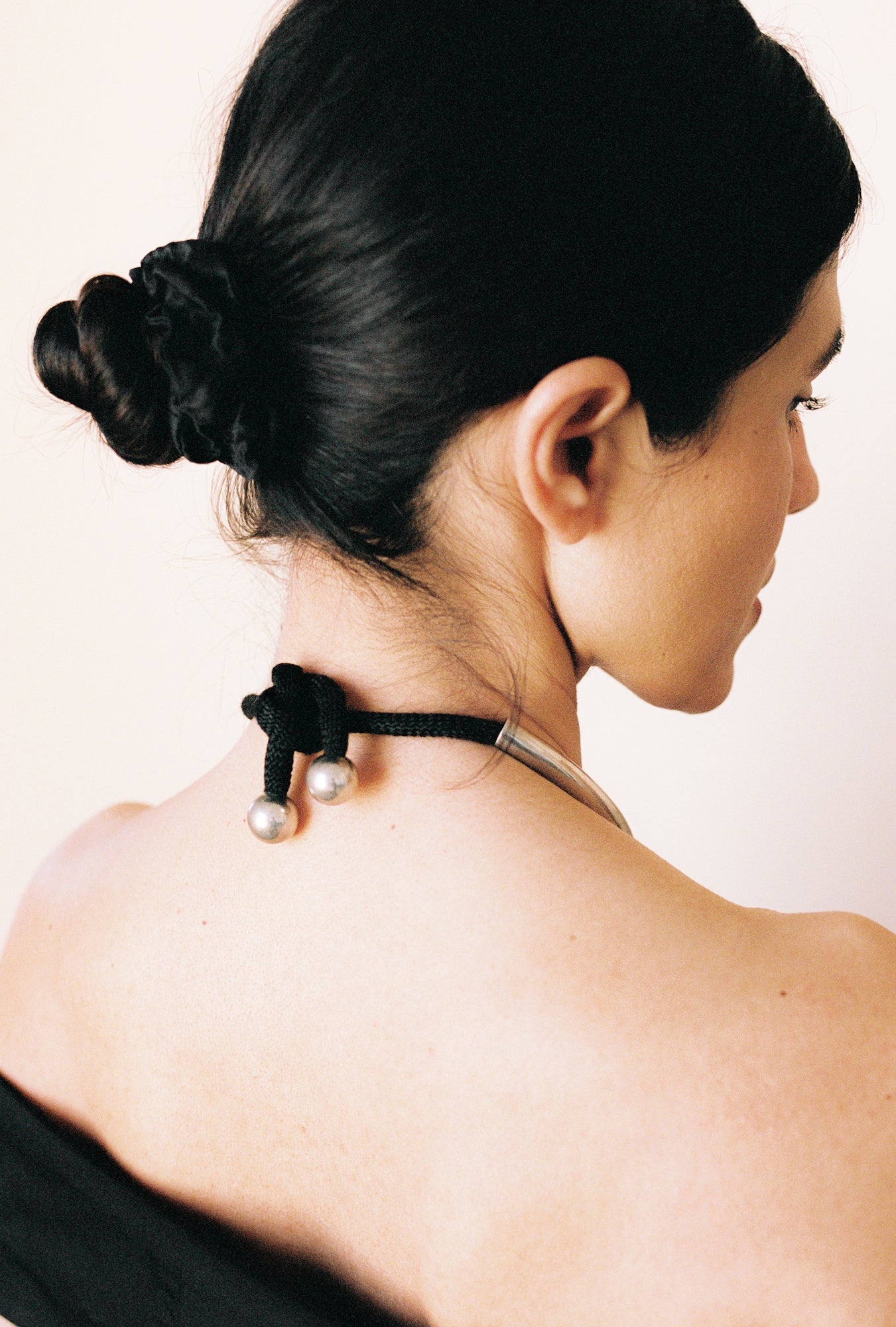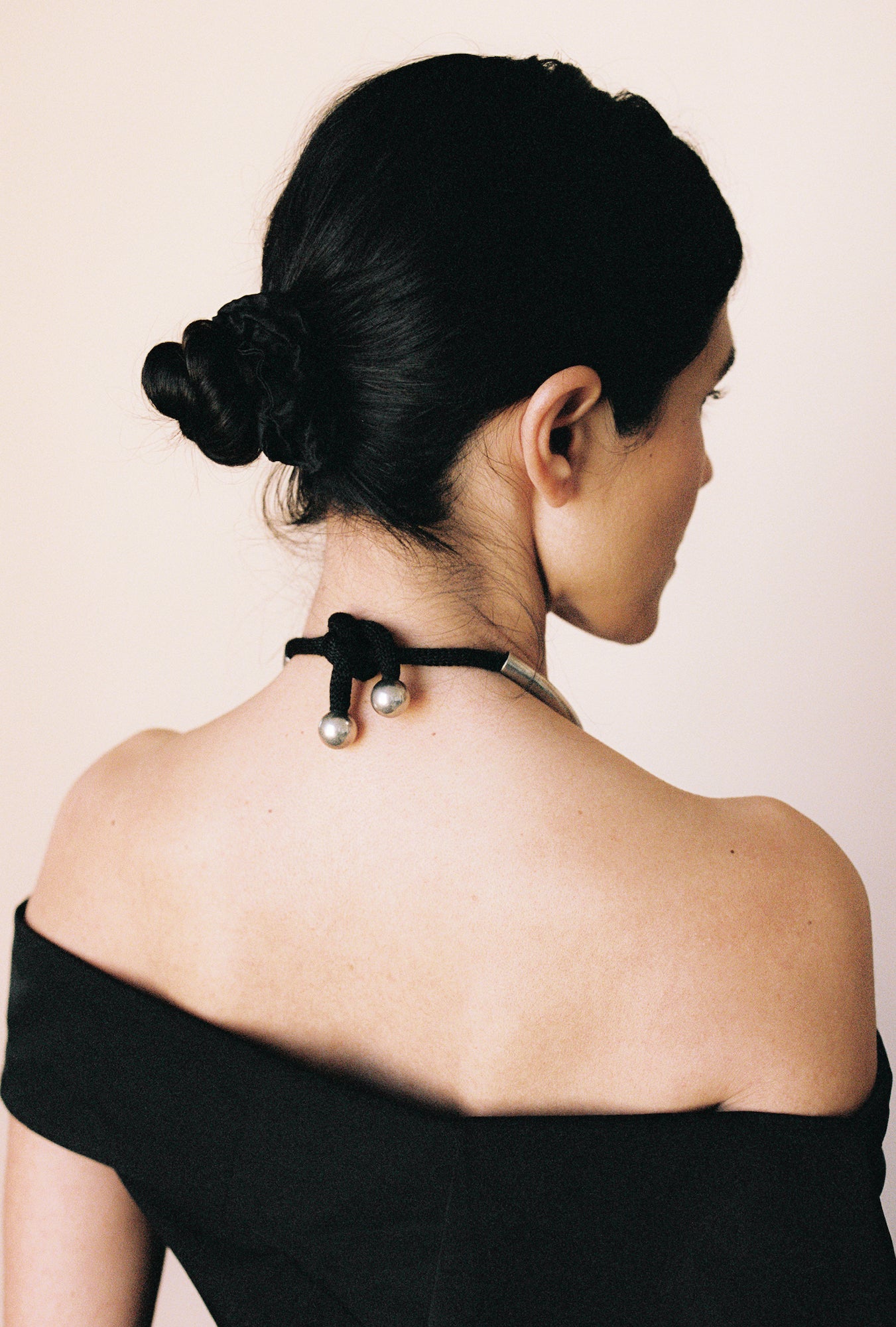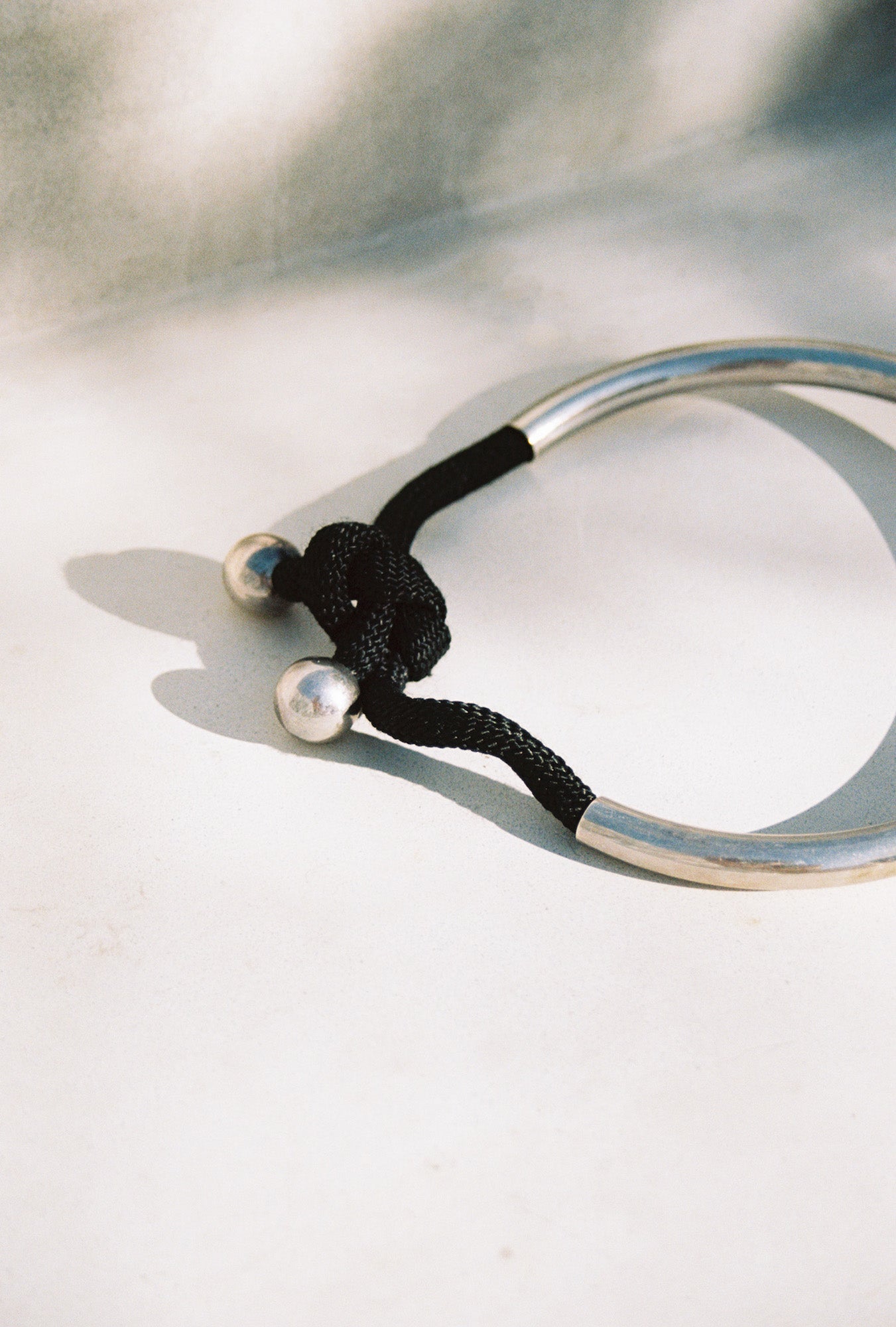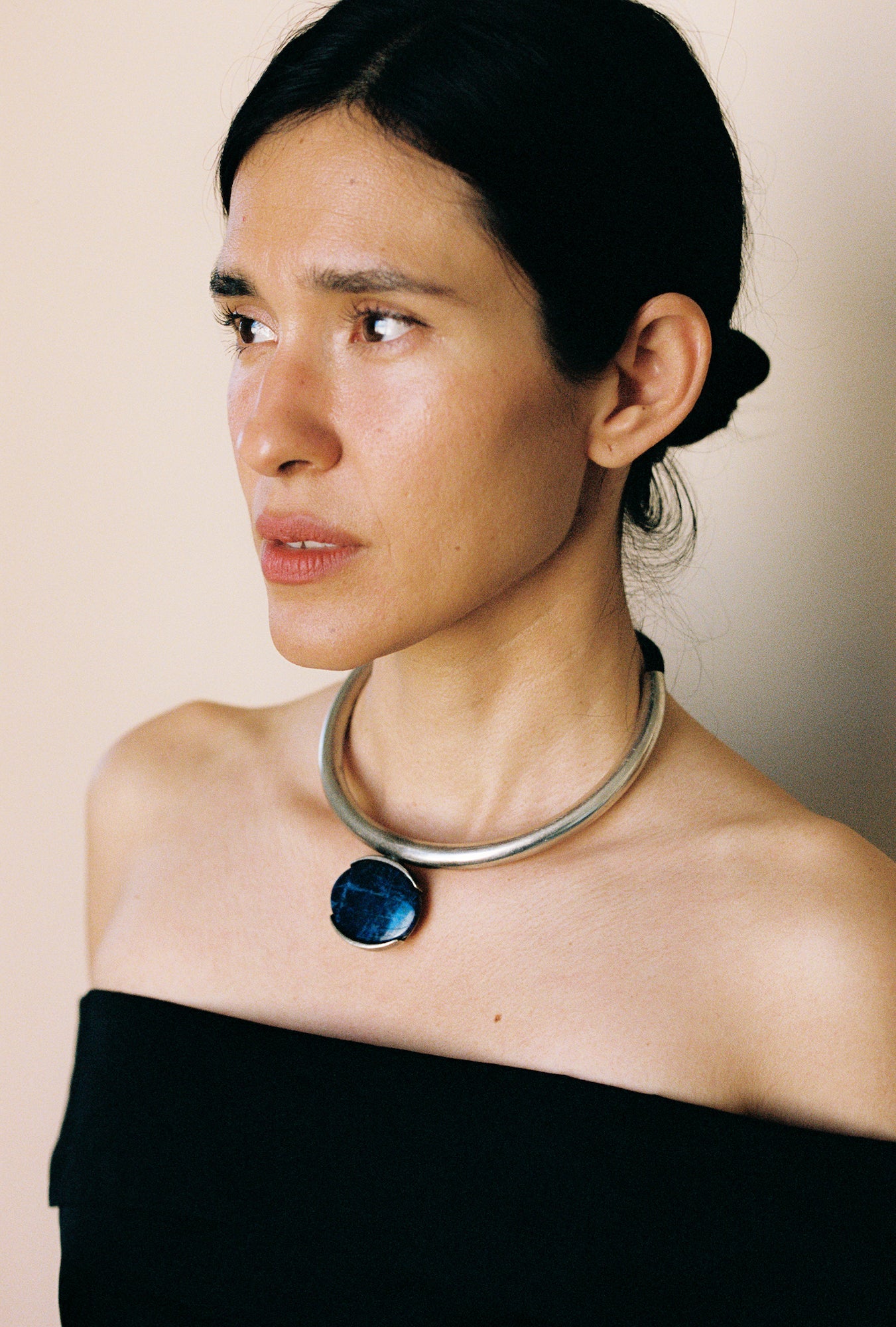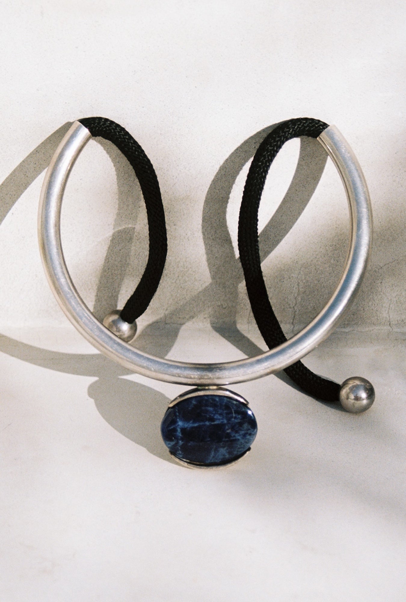 C. 1970’s modernist collar by the renowned American jewelry artist, Alfred Karram, whose work can be found in the permanent collection of many museums. The collar consists of sterling silver and a large, dark blue sodalite cabochon, suspended from an extra thick woven cord of silk rope, which knots at the back. What a stunning piece, from every angle. The perfectly forged sterling tubing suspends the sodalite centerpiece, and the silky rope is encapsulated and finished with sterling balled end caps. A very special collector’s piece, with such great day-to-night versatility. Hallmarks and purtity stamped on the bezel.