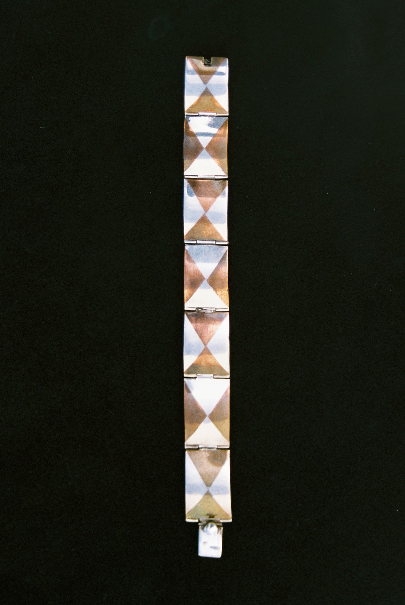 C. 1950's hinging paneled bracelet with sterling silver and gorgeous copper inlay. Expertly crafted, with amazing attention to detail. The mixed used of metals is so appropriate and timeless in this design. There is an hidden, integrated box clasp on the interior of the bracelet, secured with a satisfying “click.” An extremely comfortable and wearable place. Full Mexican artisan hallmarks with numbered eagle stamp, Hecho en Mexico DF (Mexico City).