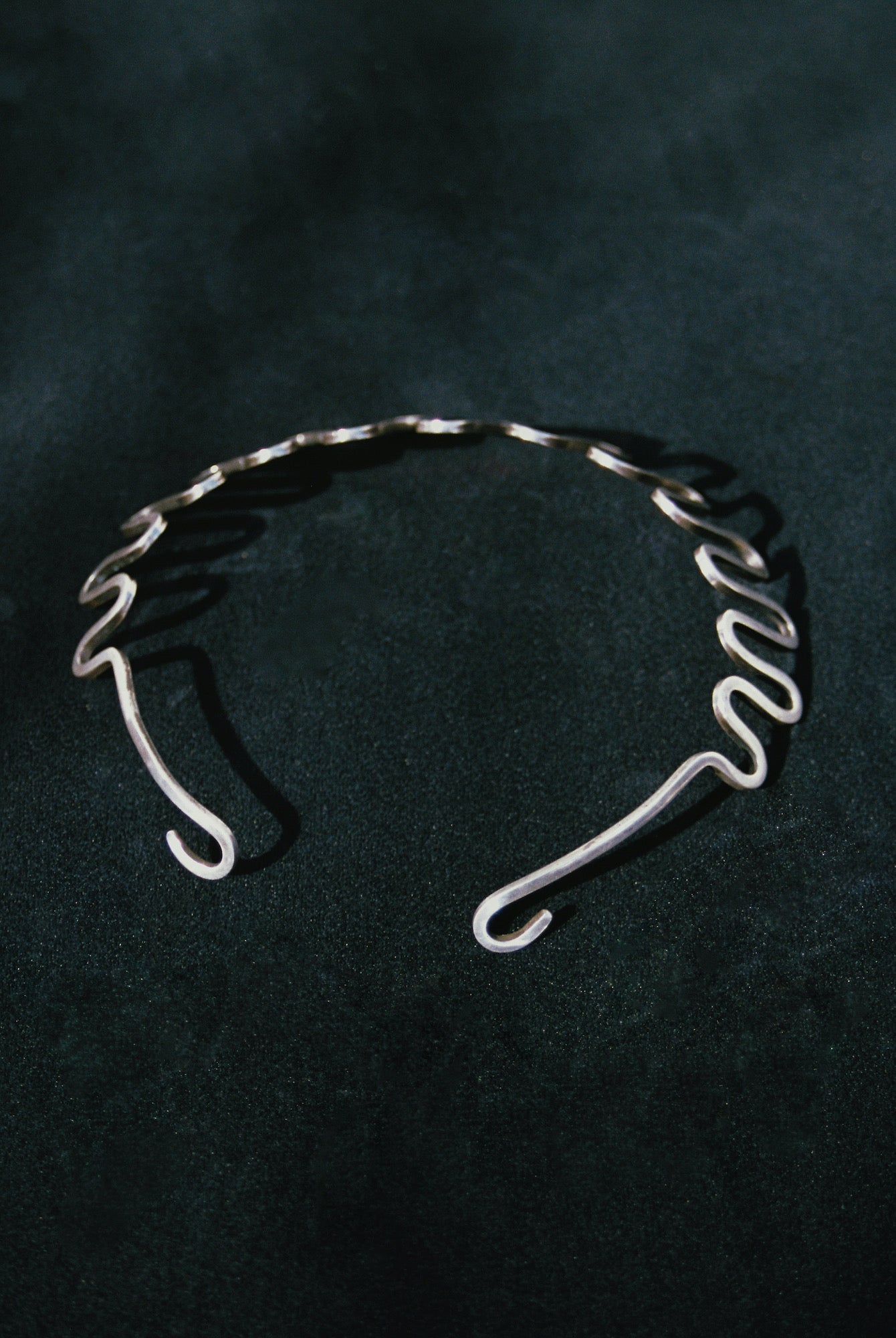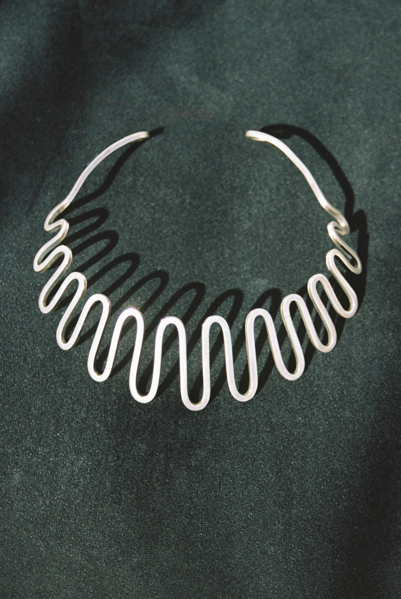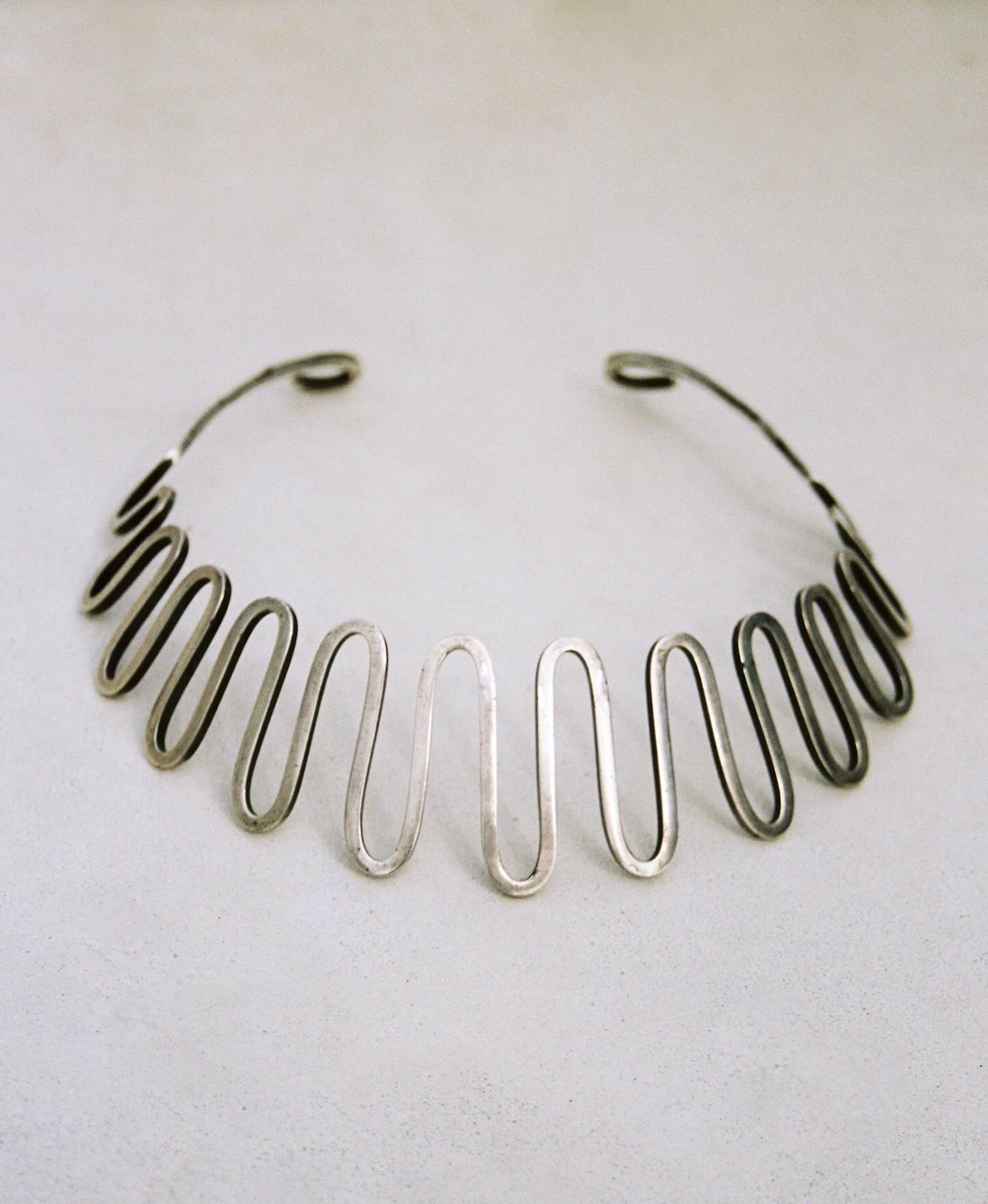C. 1950’s, exceptionally beautiful abstract sterling silver collar. This piece is made of heavy gauge squared off wire, expertly hand-forged in symmetrical waves that hug the contours of the neck like a dream. The back ends come to stylized curls. A piece that feels equally pulled from the ancient past and distant future - truly timeless. A one-of-a-kind find for any collector, in the spirit of Art Smith and Calder.