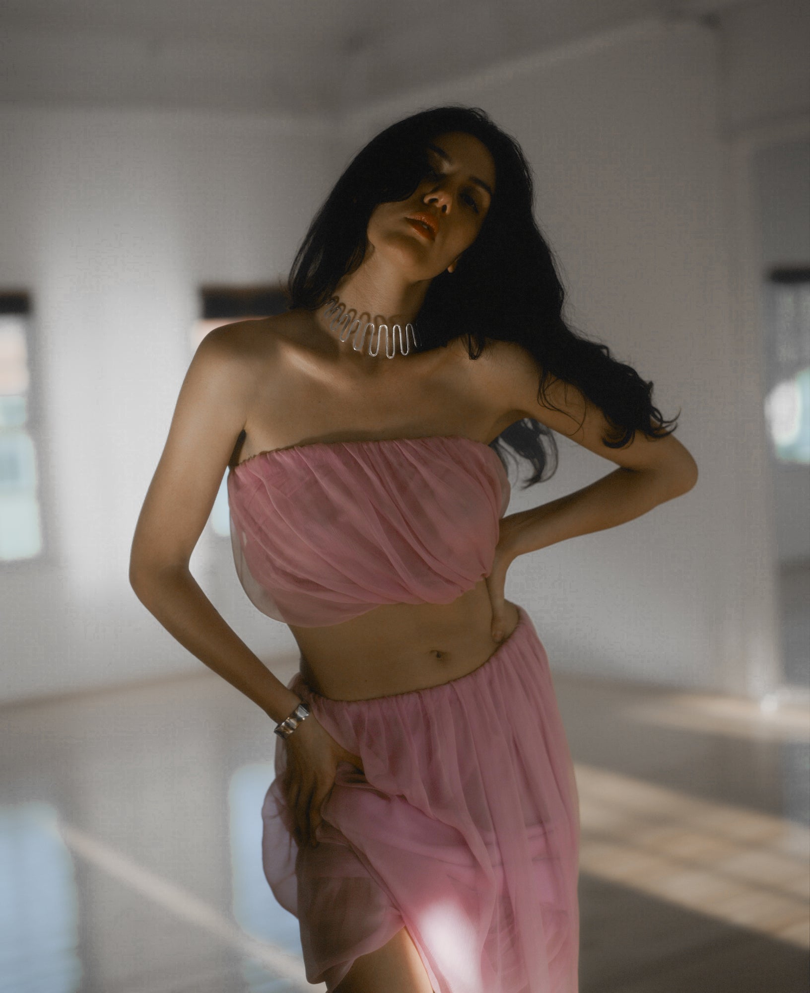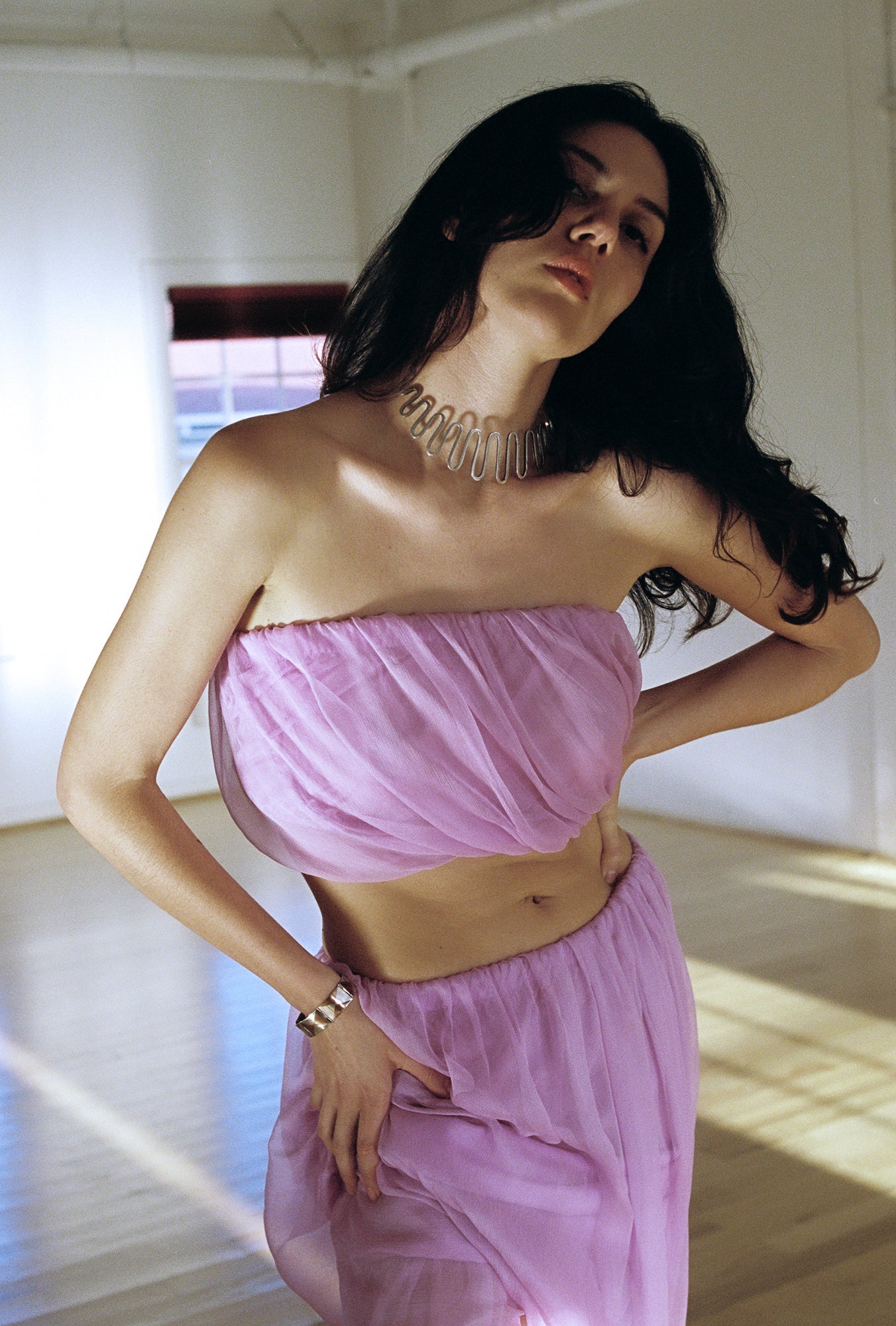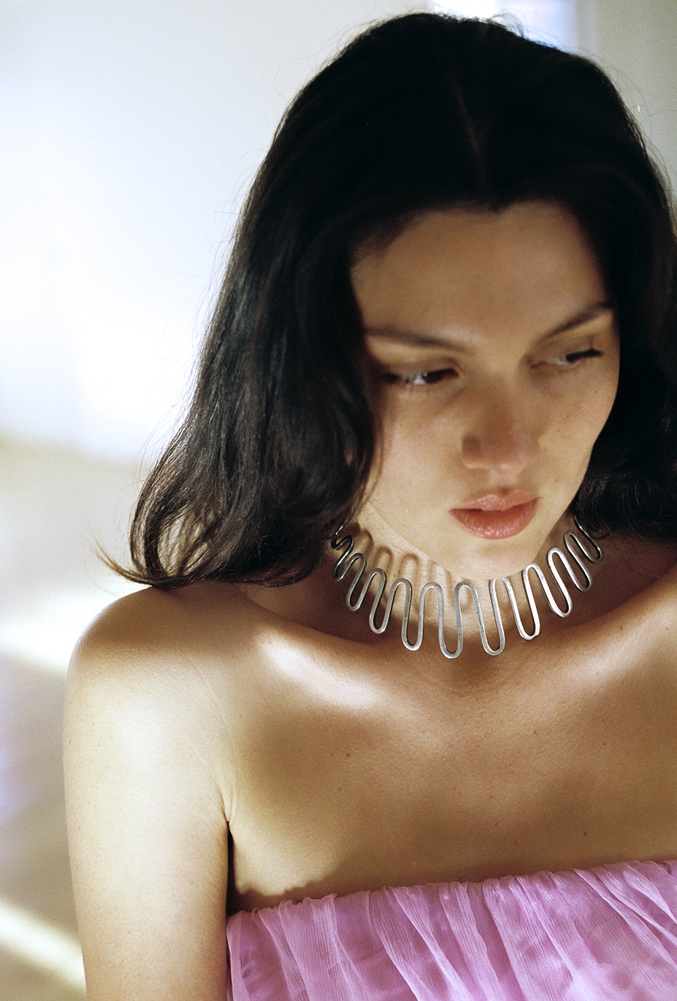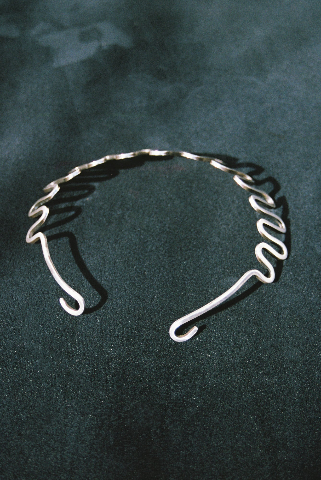 C. 1950’s, exceptionally beautiful abstract sterling silver collar. This piece is made of heavy gauge squared off wire, expertly hand-forged in symmetrical waves that hug the contours of the neck like a dream. The back ends come to stylized curls. A piece that feels equally pulled from the ancient past and distant future - truly timeless. A one-of-a-kind find for any collector, in the spirit of Art Smith and Calder.