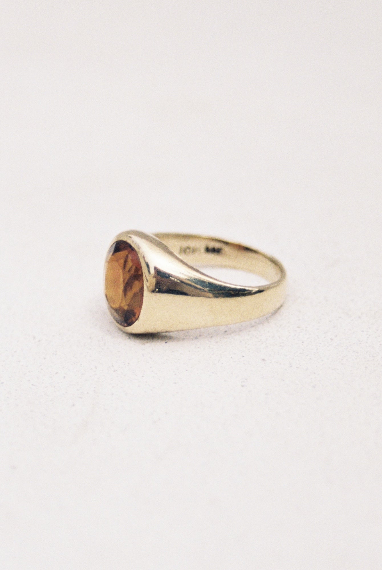 C. 1930's - 1940's faceted oval citrine flush-set signet ring in warm, buttery 10K gold. The stone is absolutely exquisite, with complex tones of lighter yellow and deep, rich honey/amber. The ring feels very substantial and comfortable on the hand, with a solid carved build. Gold purity and maker's stamps on the inside of the band.