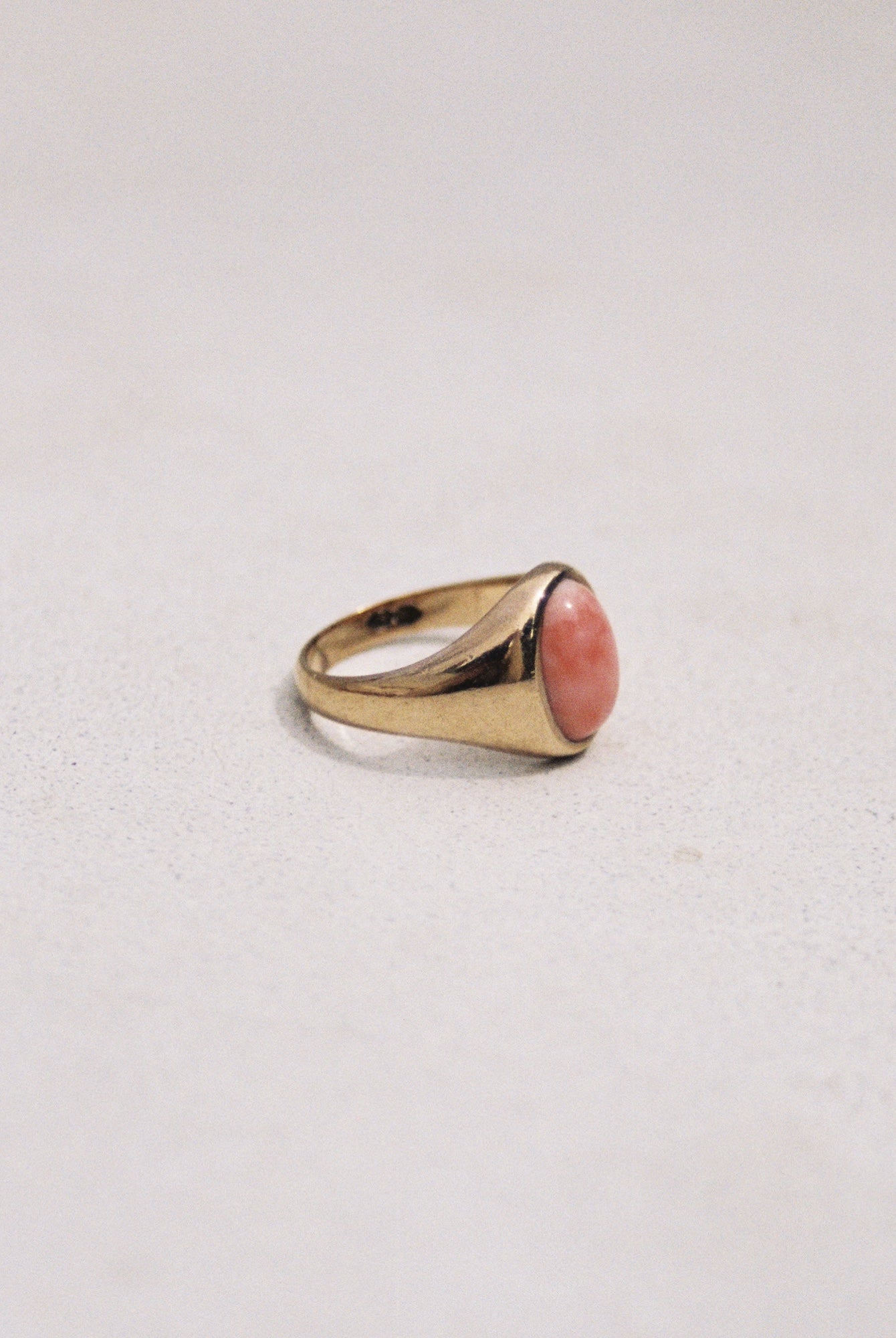 Early 1900's carved 10k yellow gold signet pinky ring, set with a peachy pink coral cabochon. Gold purity stamped on the inside of the band.