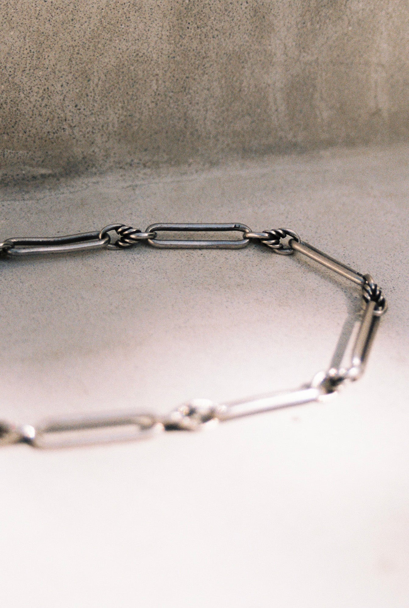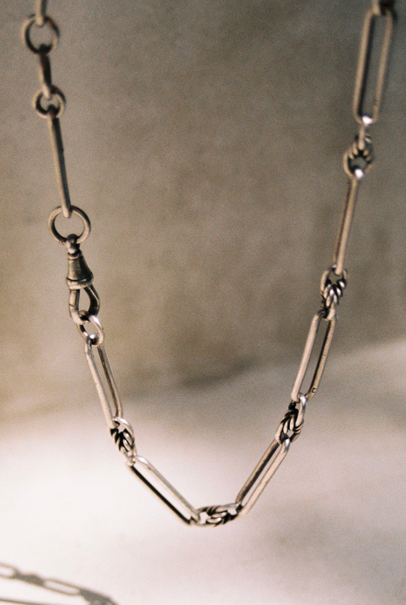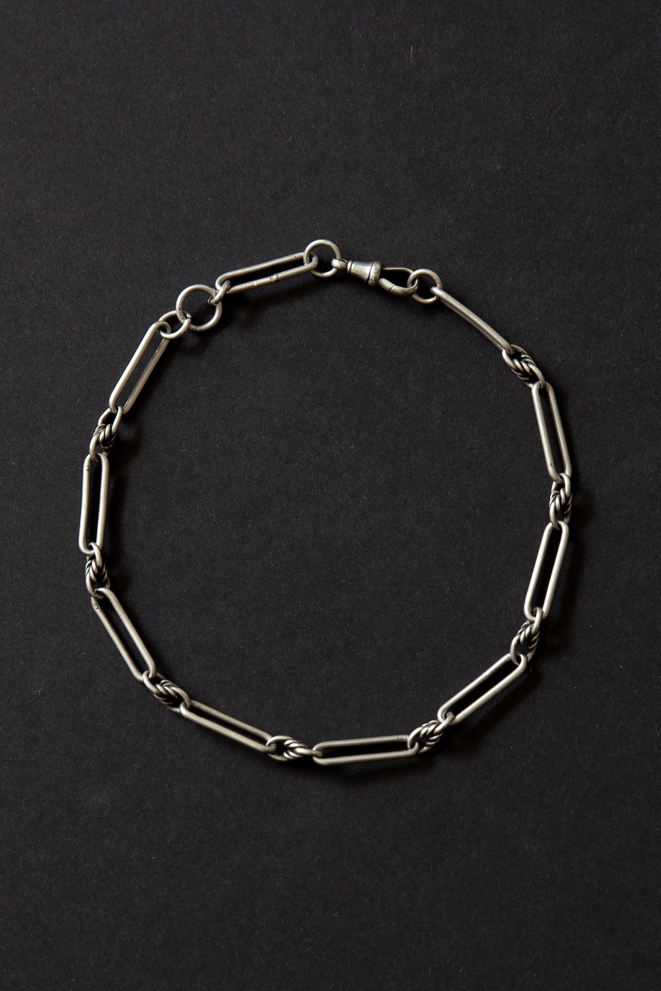 C. 1850's - 1880's, English. Gorgeous sterling silver trombone link necklace, spaced between rope-like twisted links and fastened with a dog clip clasp. This is such a beautifully fabricated chain, with a generous weight and feel. The rope-like links are constructed with such attention to detail. Purity and hallmarks on each link with lion passants (the standard English demarcation for sterling), with full hallmarks at the clasp.