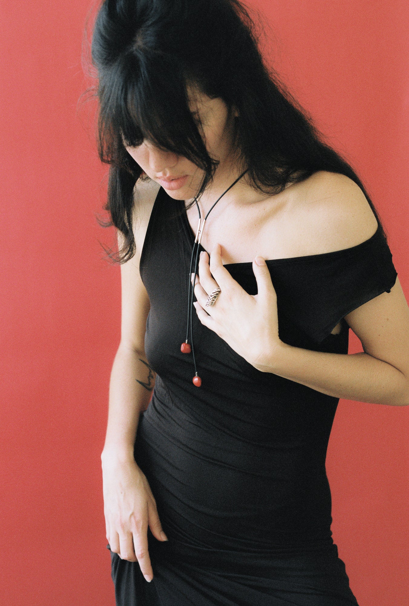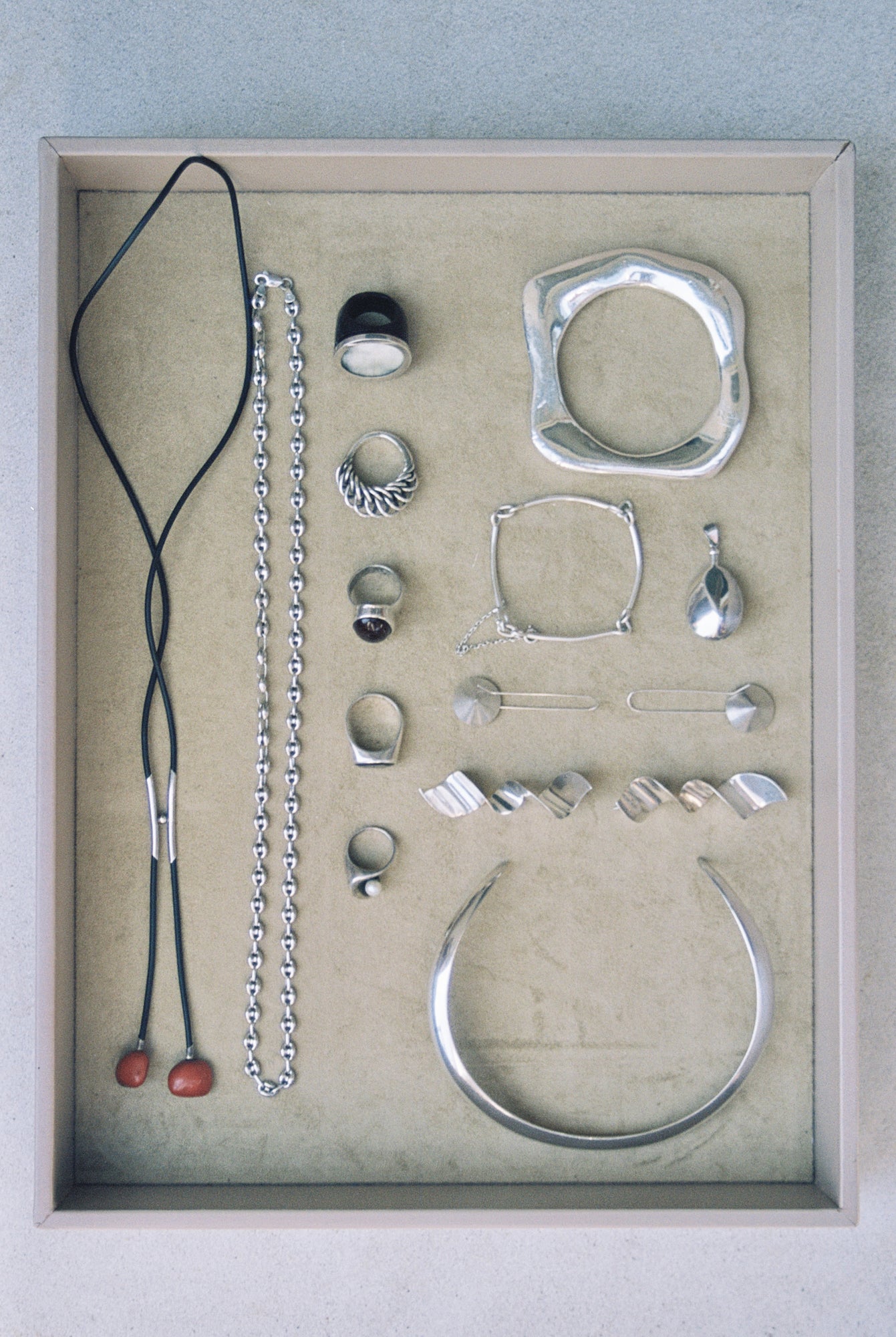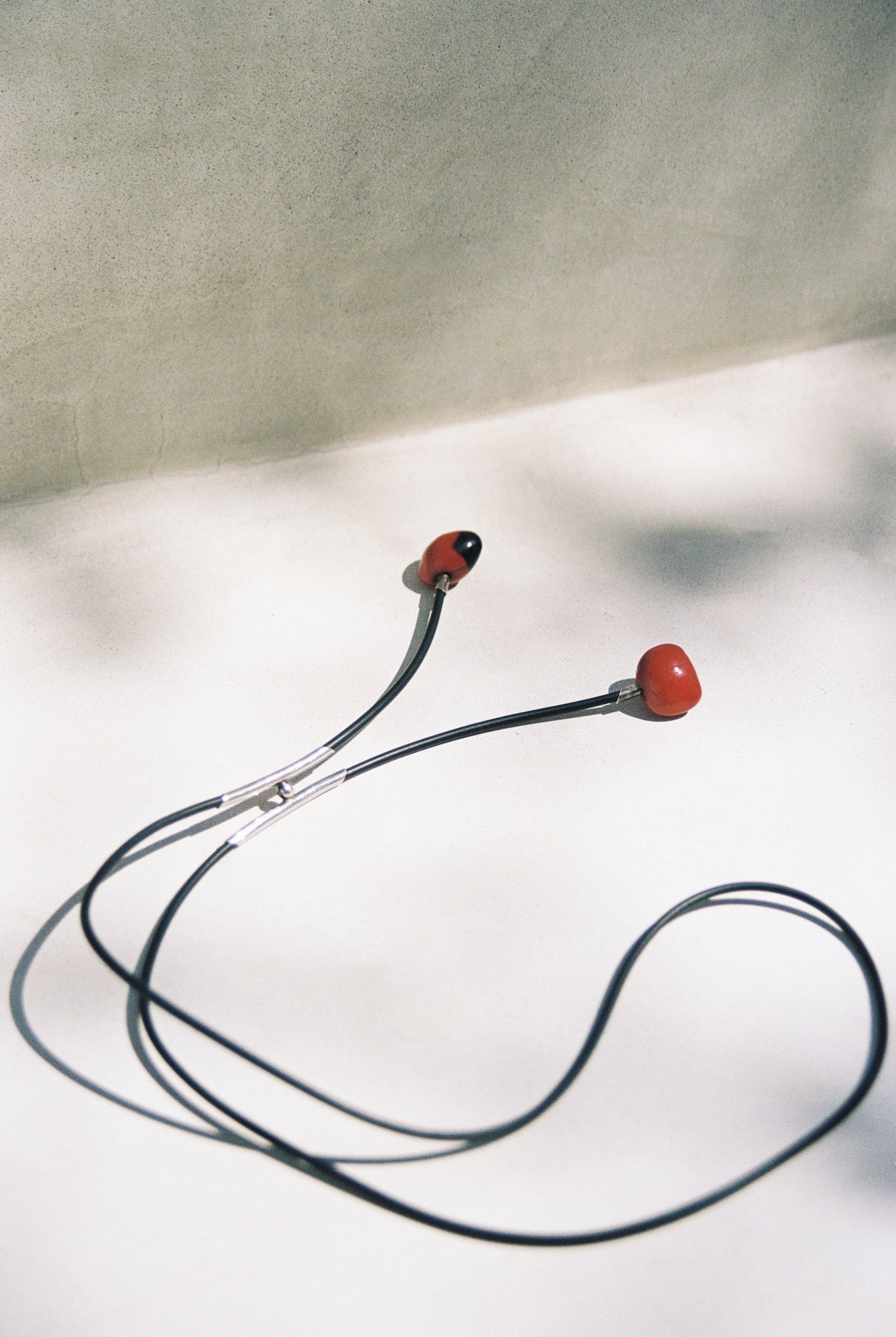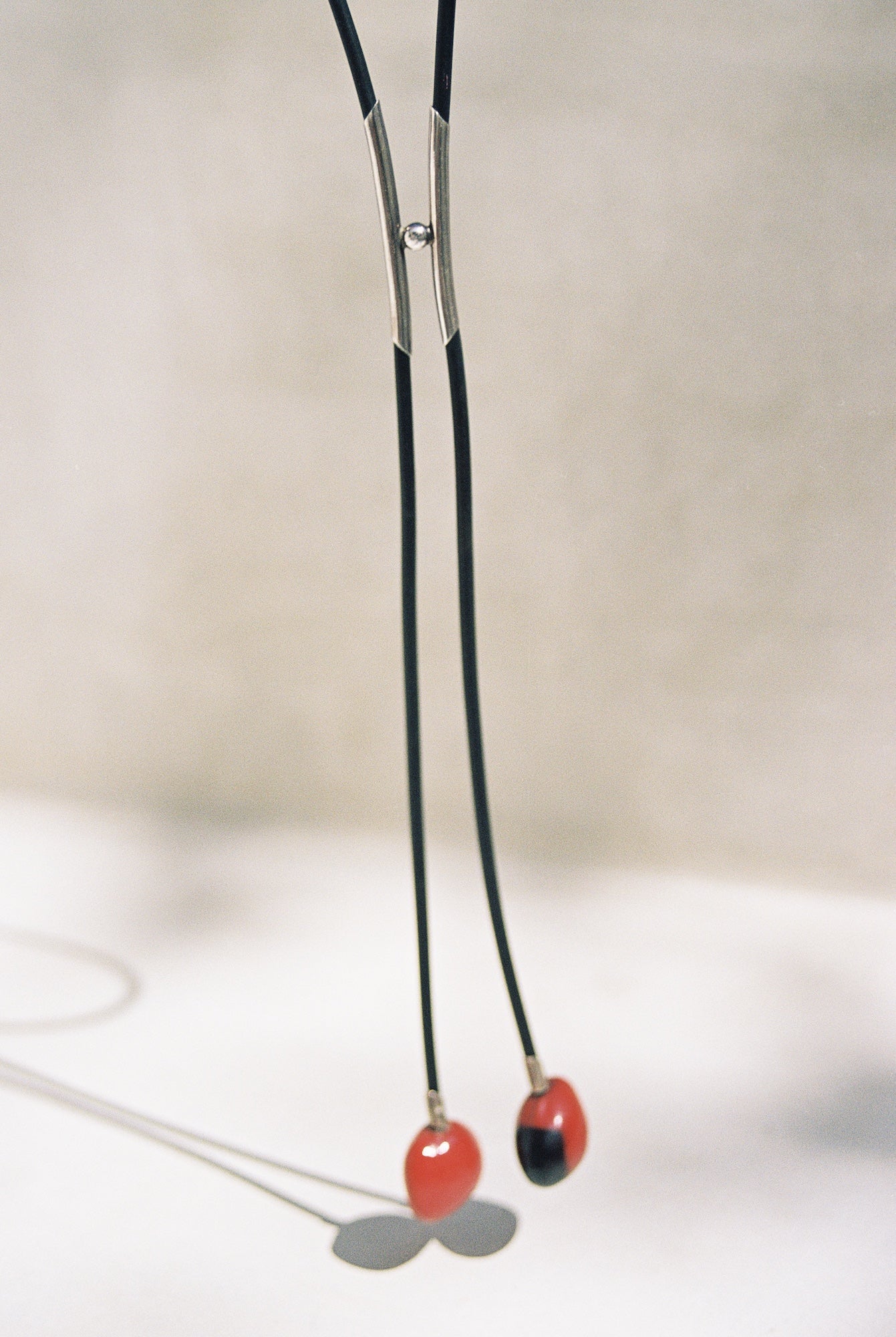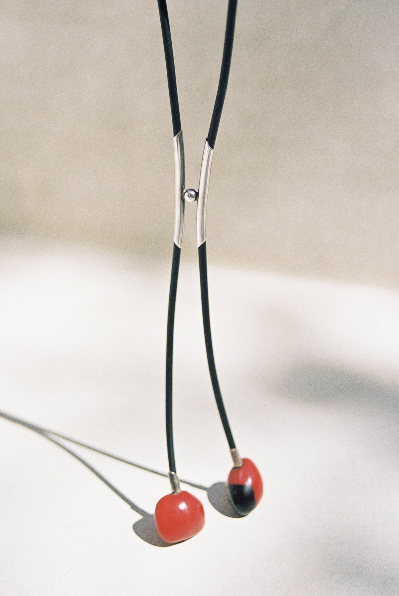 C. 1980’s-90’s Bolo tie with sterling silver closure and huayruro seeds on black rubber cord. A clever and versatile design that highlights every material incorporated in its making. The bolo fixture adjusts, and is suspended together with two silver tubes connected by a silver ball. The end tassels are huayruro seeds, which are believed to bring good luck and fertility while blocking negative energy. This is a truly captivating piece, with endless styling opportunities.